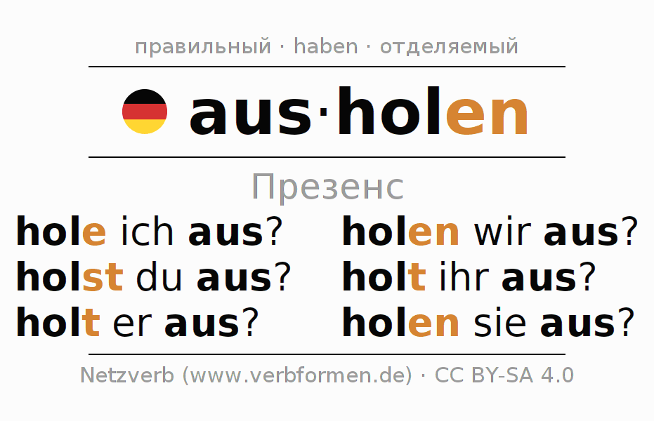 Спряжение ausholen в Презенс Индикатив Настоящее время Действительный залог (актив): hole ich aus?, holst du aus?, holt er aus?, holen wir aus?, holt ihr aus?, holen sie aus?.Образование этих форм происходит по определённым грамматическим правилам. Так же спрягаются простые глагольные формы ausholen в Презенс. Kомментарии ☆