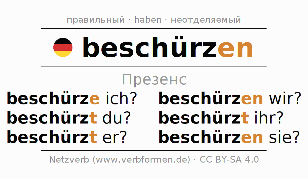 Спряжение beschürzen в Презенс Индикатив Настоящее время Действительный залог (актив): beschürze ich?, beschürzt du?, beschürzt er?, beschürzen wir?, beschürzt ihr?, beschürzen sie?.Образование этих форм происходит по определённым грамматическим правилам. Так же спрягаются простые глагольные формы beschürzen в Презенс. Kомментарии ☆
