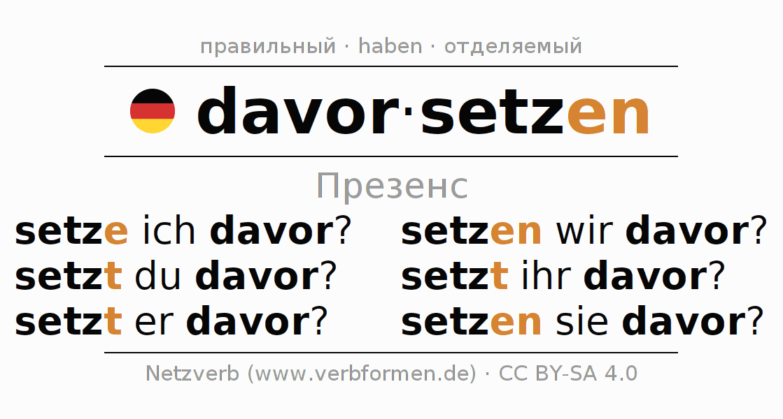Спряжение davorsetzen в Презенс Индикатив Настоящее время Действительный залог (актив): setze ich davor?, setzt du davor?, setzt er davor?, setzen wir davor?, setzt ihr davor?, setzen sie davor?.Образование этих форм происходит по определённым грамматическим правилам. Так же спрягаются простые глагольные формы davorsetzen в Презенс. Kомментарии ☆