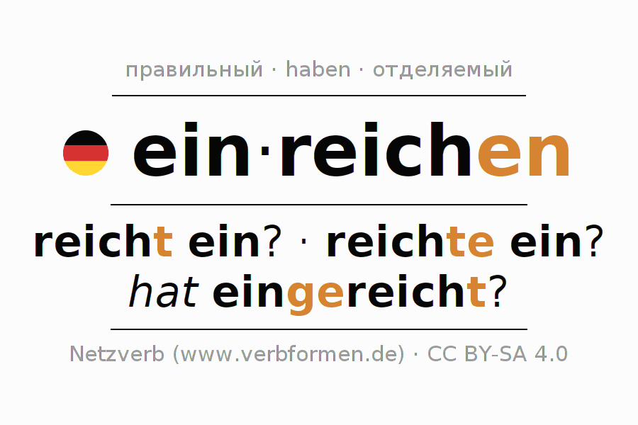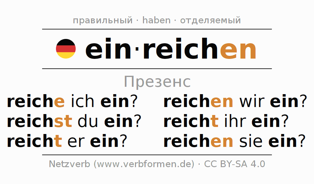 Спряжение einreichen в Презенс Индикатив Настоящее время Действительный залог (актив): reiche ich ein?, reichst du ein?, reicht er ein?, reichen wir ein?, reicht ihr ein?, reichen sie ein?.Образование этих форм происходит по определённым грамматическим правилам. Так же спрягаются простые глагольные формы einreichen в Презенс. Kомментарии ☆