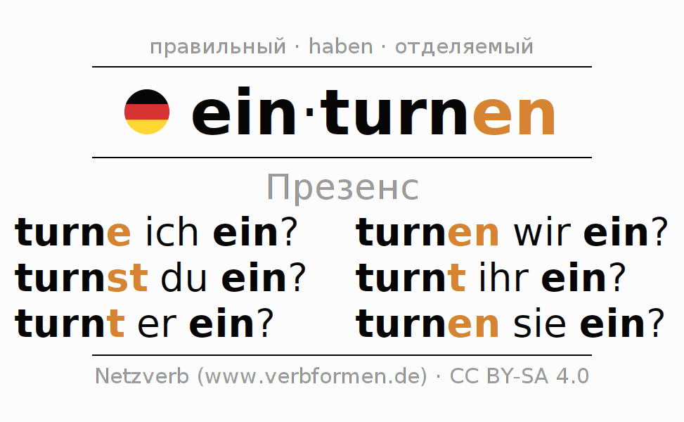 Спряжение einturnen в Презенс Индикатив Настоящее время Действительный залог (актив): turne ich ein?, turnst du ein?, turnt er ein?, turnen wir ein?, turnt ihr ein?, turnen sie ein?.Образование этих форм происходит по определённым грамматическим правилам. Так же спрягаются простые глагольные формы einturnen в Презенс. Kомментарии ☆