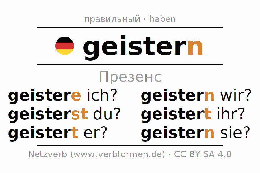 Спряжение geistern в Презенс Индикатив Настоящее время Действительный залог (актив): geist(e)re ich?, geisterst du?, geistert er?, geistern wir?, geistert ihr?, geistern sie?.Образование этих форм происходит по определённым грамматическим правилам. Так же спрягаются простые глагольные формы geistern в Презенс. Kомментарии ☆