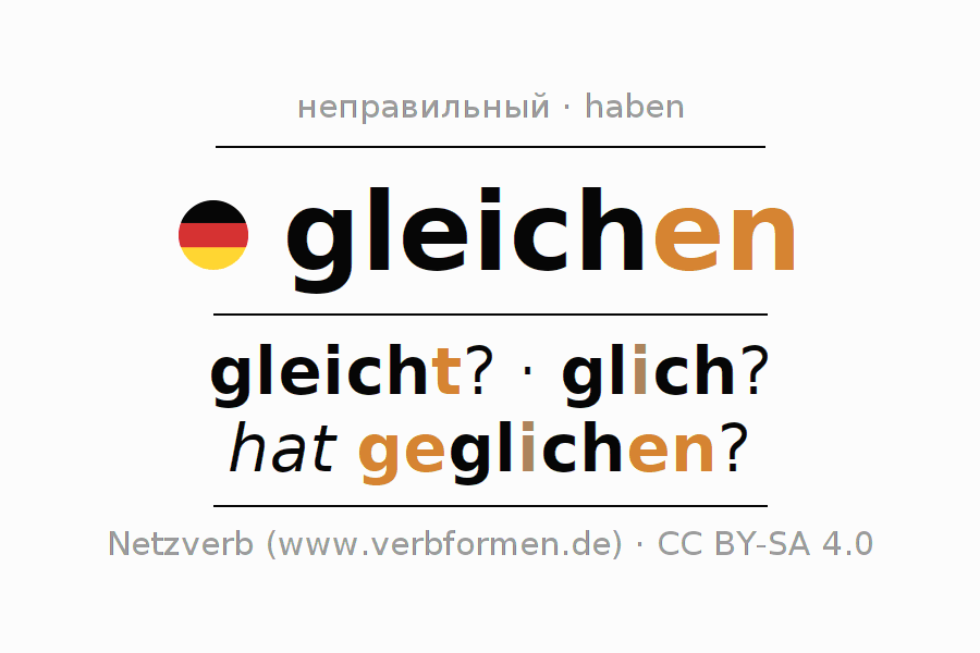 Спряжение gleichen в Презенс Индикатив Настоящее время Действительный залог (актив): gleiche ich?, gleichst du?, gleicht er?, gleichen wir?, gleicht ihr?, gleichen sie?.Образование этих форм происходит по определённым грамматическим правилам. Так же спрягаются простые глагольные формы gleichen в Презенс. Kомментарии ☆