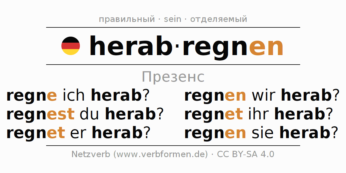 Этот глагол herabregnen полностью спрягается во всех лицах и числах Презенс Индикатив.