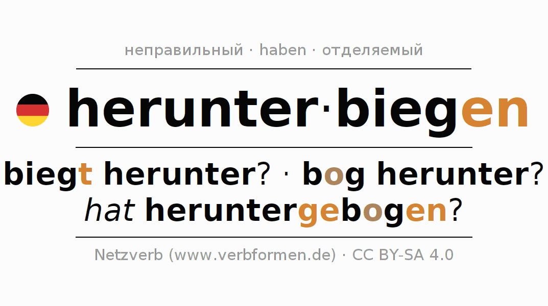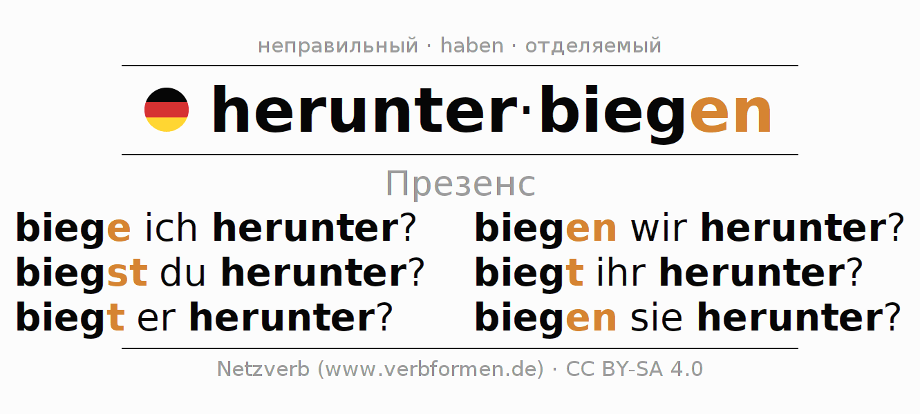 Спряжение herunterbiegen в Презенс Индикатив Настоящее время Действительный залог (актив): biege ich herunter?, biegst du herunter?, biegt er herunter?, biegen wir herunter?, biegt ihr herunter?, biegen sie herunter?.Образование этих форм происходит по определённым грамматическим правилам. Так же спрягаются простые глагольные формы herunterbiegen в Презенс. Kомментарии ☆