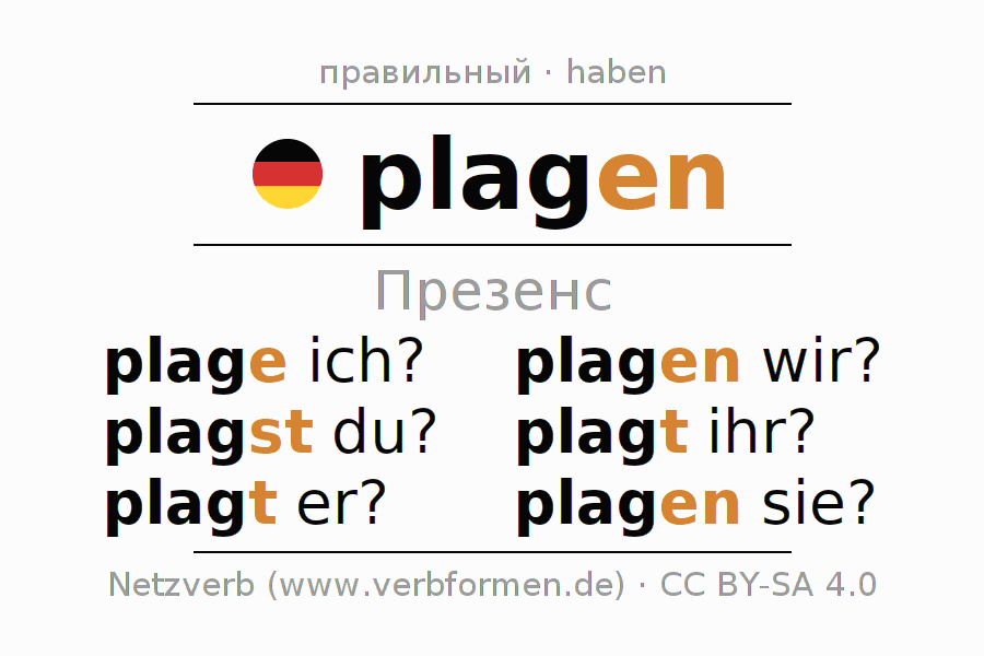 Спряжение plagen в Презенс Индикатив Настоящее время Действительный залог (актив): plage ich?, plagst du?, plagt er?, plagen wir?, plagt ihr?, plagen sie?.Образование этих форм происходит по определённым грамматическим правилам. Так же спрягаются простые глагольные формы plagen в Презенс. Kомментарии ☆