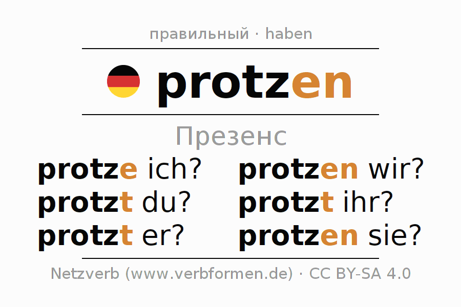 Спряжение protzen в Презенс Индикатив Настоящее время Действительный залог (актив): protze ich?, protzt du?, protzt er?, protzen wir?, protzt ihr?, protzen sie?.Образование этих форм происходит по определённым грамматическим правилам. Так же спрягаются простые глагольные формы protzen в Презенс. Kомментарии ☆