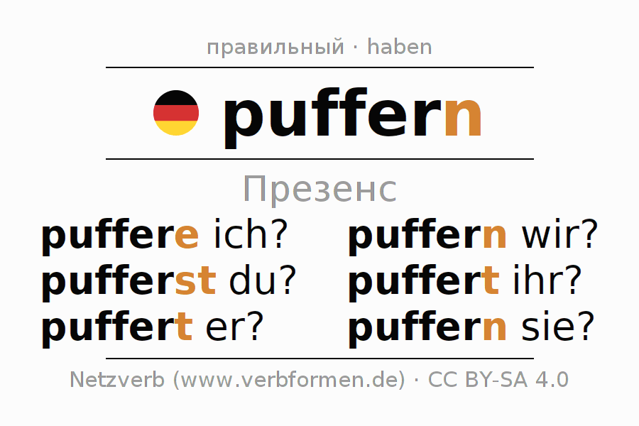 Спряжение puffern в Презенс Индикатив Настоящее время Действительный залог (актив): puff(e)re ich?, pufferst du?, puffert er?, puffern wir?, puffert ihr?, puffern sie?.Образование этих форм происходит по определённым грамматическим правилам. Так же спрягаются простые глагольные формы puffern в Презенс. Kомментарии ☆