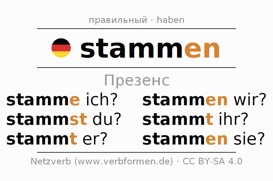 Спряжение stammen в Презенс Индикатив Настоящее время Действительный залог (актив): stamme ich?, stammst du?, stammt er?, stammen wir?, stammt ihr?, stammen sie?.Образование этих форм происходит по определённым грамматическим правилам. Так же спрягаются простые глагольные формы stammen в Презенс. 1Комментарий ☆5.0
