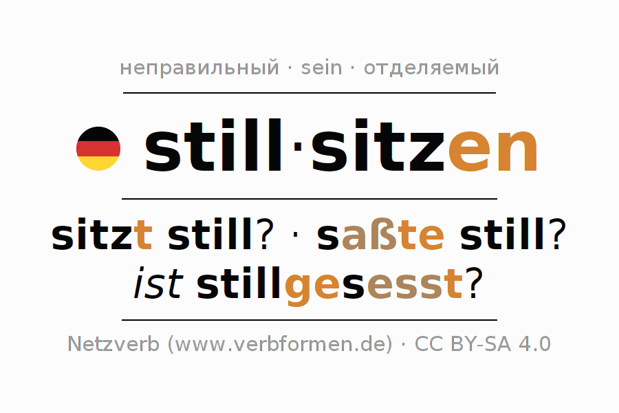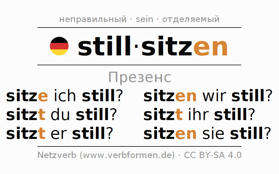 Спряжение stillsitzen в Презенс Индикатив Настоящее время Действительный залог (актив): sitze ich still?, sitzt du still?, sitzt er still?, sitzen wir still?, sitzt ihr still?, sitzen sie still?.Образование этих форм происходит по определённым грамматическим правилам. Так же спрягаются простые глагольные формы stillsitzen в Презенс. Kомментарии ☆