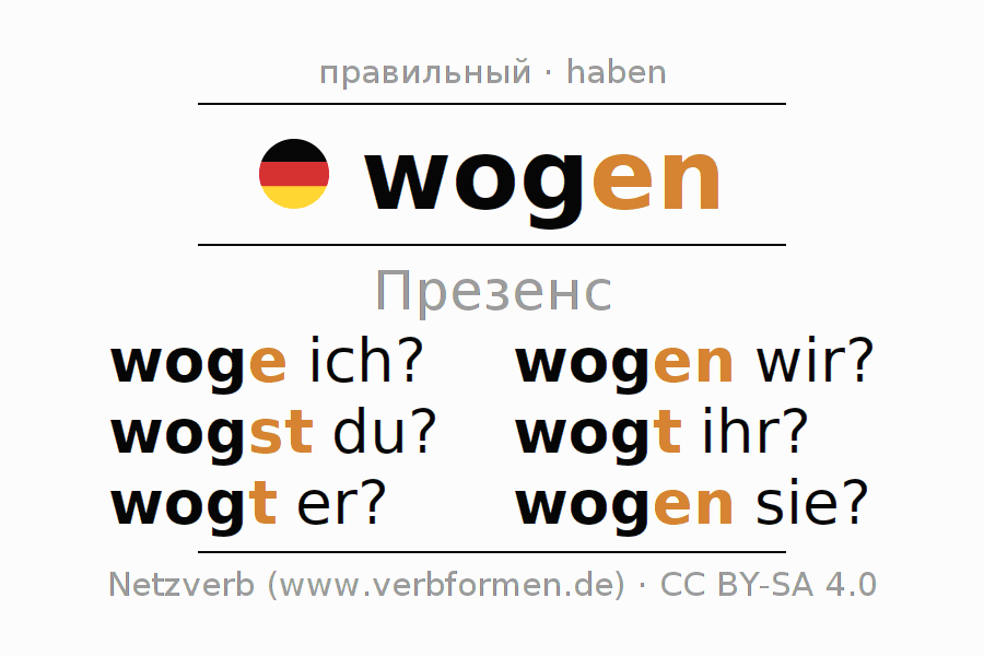 Спряжение wogen в Презенс Индикатив Настоящее время Действительный залог (актив): woge ich?, wogst du?, wogt er?, wogen wir?, wogt ihr?, wogen sie?.Образование этих форм происходит по определённым грамматическим правилам. Так же спрягаются простые глагольные формы wogen в Презенс. Kомментарии ☆