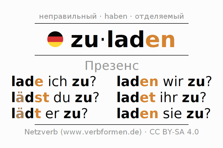 Спряжение zuladen в Презенс Индикатив Настоящее время Действительный залог (актив): lade ich zu?, lädst du zu?, lädt er zu?, laden wir zu?, ladet ihr zu?, laden sie zu?.Образование этих форм происходит по определённым грамматическим правилам. Так же спрягаются простые глагольные формы zuladen в Презенс. Kомментарии ☆