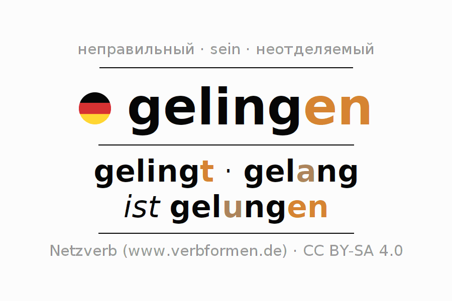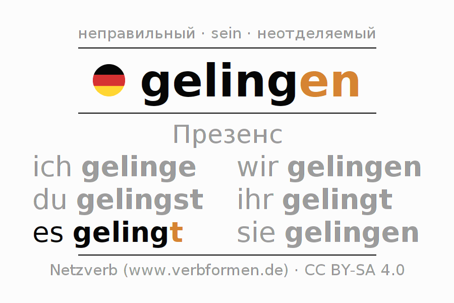 Спряжение gelingen (удаваться, получаться) в настоящем времени Презенс: ich gelinge, du gelingst, es gelingt, wir gelingen, ihr gelingt, sie gelingen