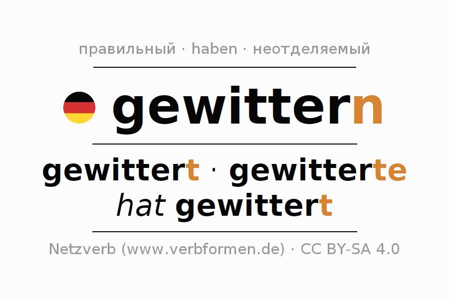 Спряжение gewittern (греметь, громить) в настоящем времени Презенс: ich gewitt(e)re, du gewitterst, er gewittert, wir gewittern, ihr gewittert, sie gewittern