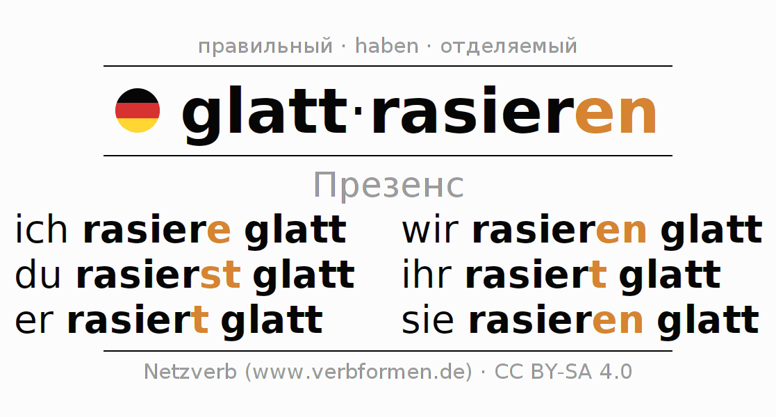 Спряжение glattrasieren (гладко брить) в настоящем времени Презенс: ich rasiere glatt, du rasierst glatt, er rasiert glatt, wir rasieren glatt, ihr rasiert glatt, sie rasieren glatt