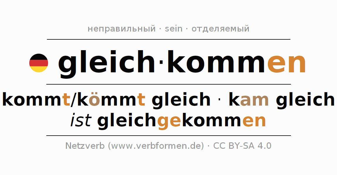 Спряжение gleichkommen (равняться, быть равным) в настоящем времени Презенс: ich komme gleich, du kommst/kömmst gleich, er kommt/kömmt gleich, wir kommen gleich, ihr kommt gleich, sie kommen gleich