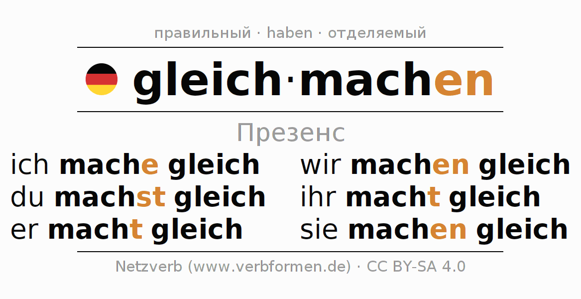 Спряжение gleichmachen (сравнивать, уравнивать) в настоящем времени Презенс: ich mache gleich, du machst gleich, er macht gleich, wir machen gleich, ihr macht gleich, sie machen gleich