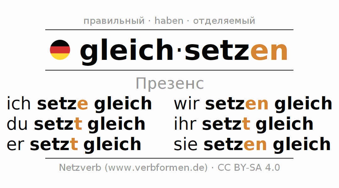 Спряжение gleichsetzen (приравнивать, отождествлять) в настоящем времени Презенс: ich setze gleich, du setzt gleich, er setzt gleich, wir setzen gleich, ihr setzt gleich, sie setzen gleich