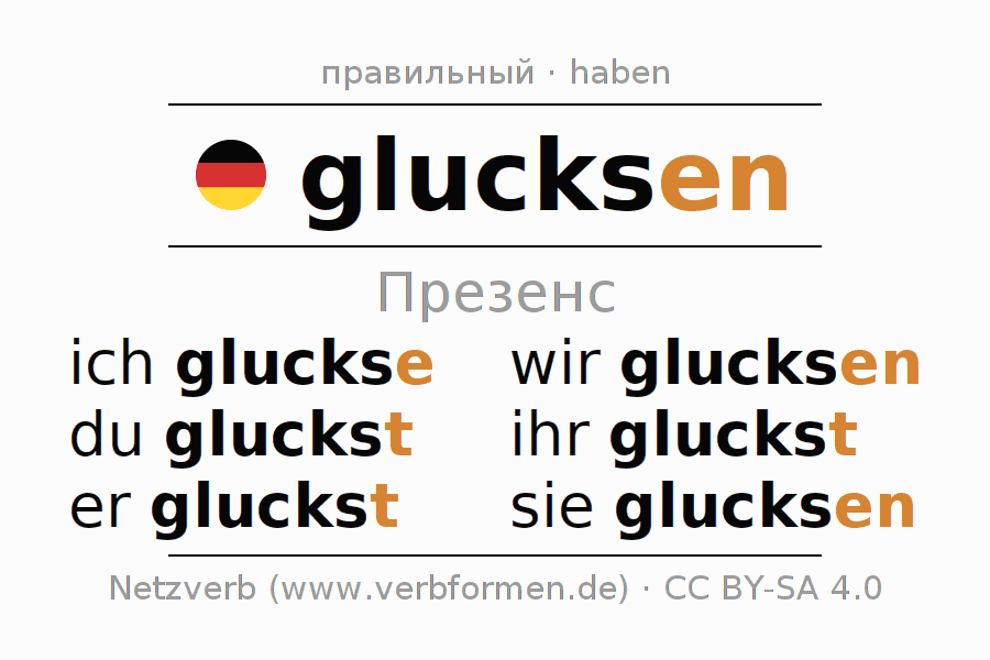 Спряжение glucksen (булькать, клохтать) в настоящем времени Презенс: ich gluckse, du gluckst, er gluckst, wir glucksen, ihr gluckst, sie glucksen