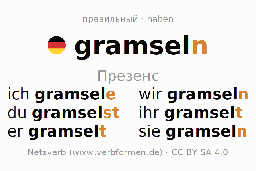 Спряжение gramseln (извиваться, крутиться) в настоящем времени Презенс: ich grams(e)le, du gramselst, er gramselt, wir gramseln, ihr gramselt, sie gramseln