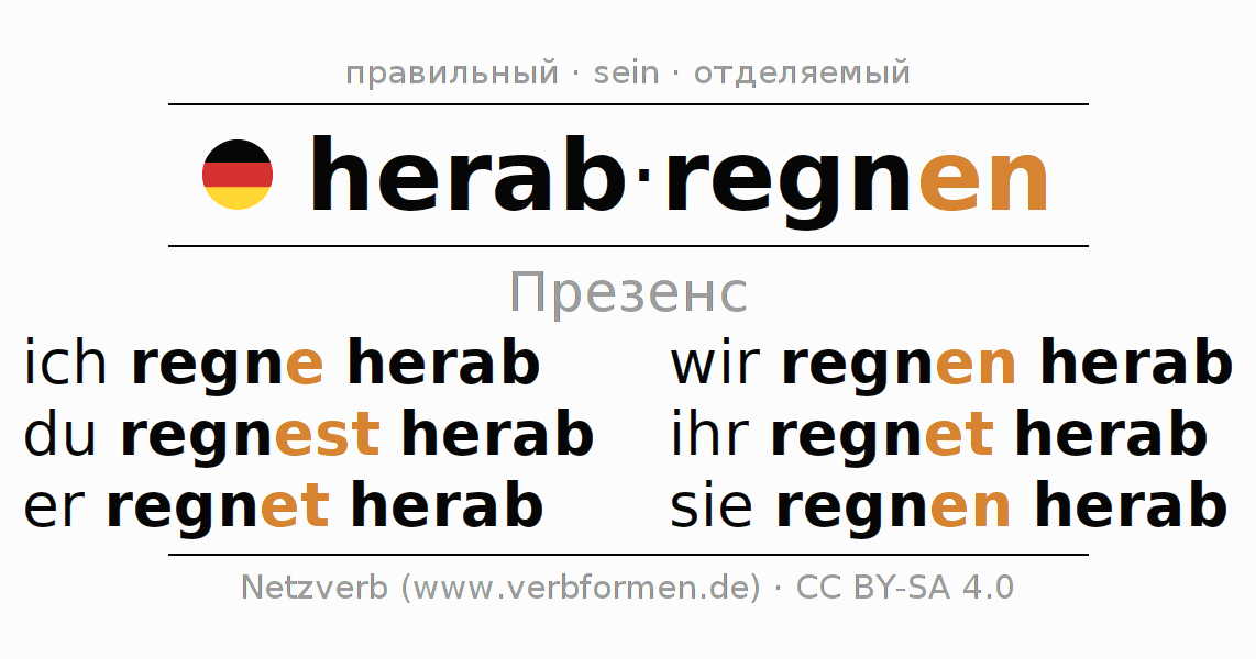 Спряжение herabregnen (падать, сыпаться) в настоящем времени Презенс: ich regne herab, du regnest herab, er regnet herab, wir regnen herab, ihr regnet herab, sie regnen herab