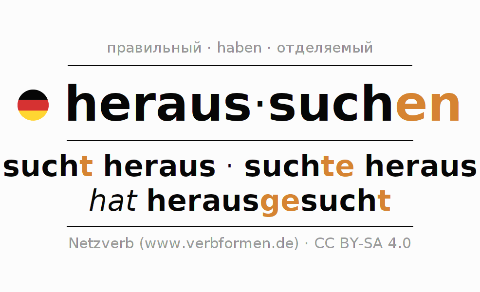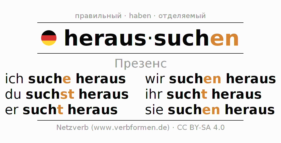 Спряжение heraussuchen (выбирать, выбрать) в настоящем времени Презенс: ich suche heraus, du suchst heraus, er sucht heraus, wir suchen heraus, ihr sucht heraus, sie suchen heraus