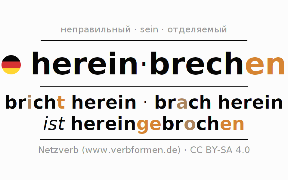 Спряжение hereinbrechen (вломиться, внезапно) в настоящем времени Презенс: ich breche herein, du brichst herein, er bricht herein, wir brechen herein, ihr brecht herein, sie brechen herein