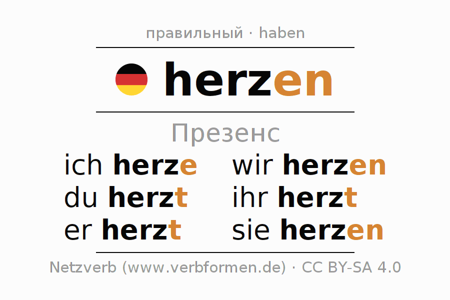 Спряжение herzen (обнимать) в настоящем времени Презенс: ich herze, du herzt, er herzt, wir herzen, ihr herzt, sie herzen