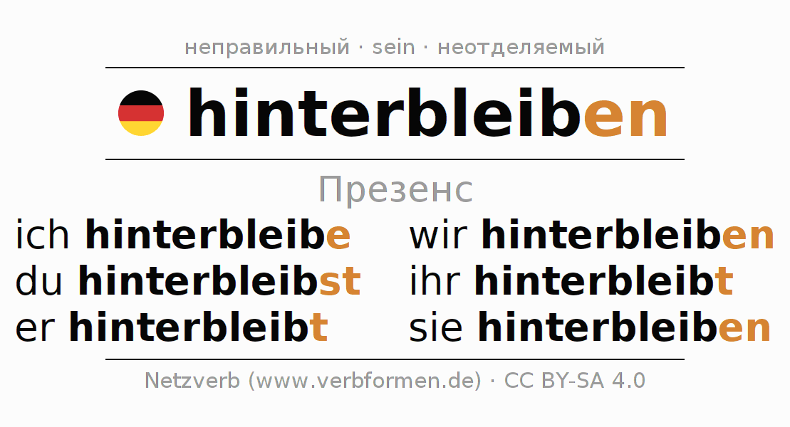 Спряжение hinterbleiben (оставаться, выживать) в настоящем времени Презенс: ich hinterbleibe, du hinterbleibst, er hinterbleibt, wir hinterbleiben, ihr hinterbleibt, sie hinterbleiben