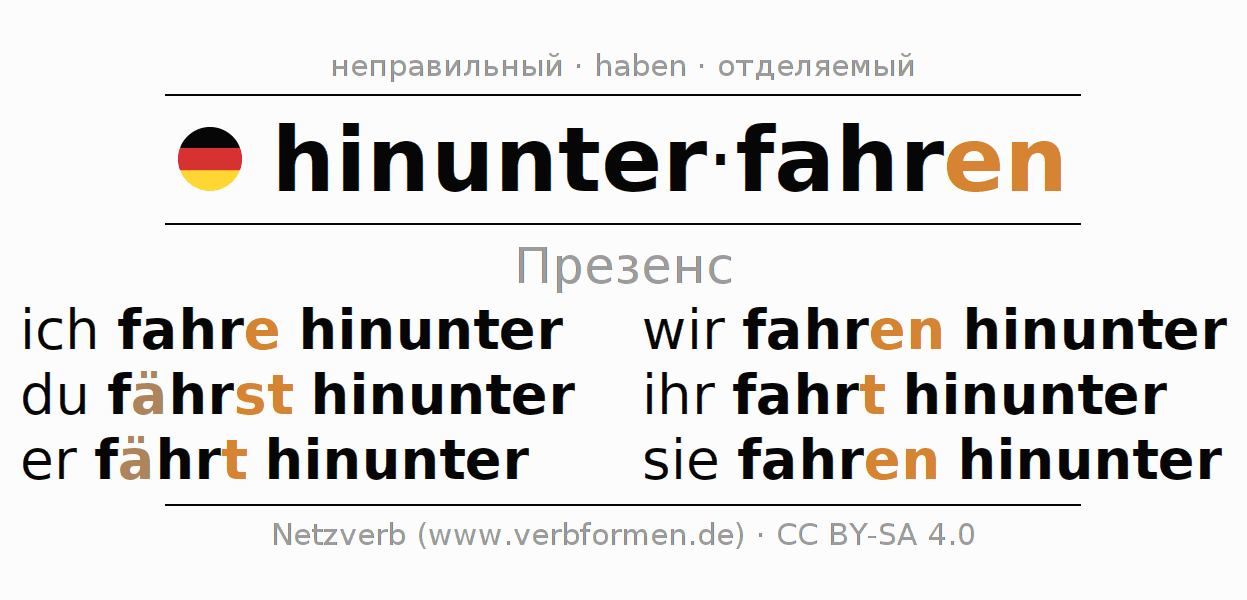 Спряжение hinunterfahren (спускаться) в настоящем времени Презенс: ich fahre hinunter, du fährst hinunter, er fährt hinunter, wir fahren hinunter, ihr fahrt hinunter, sie fahren hinunter
