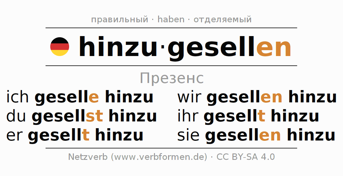 Спряжение hinzugesellen (подходить, присоединяться) в настоящем времени Презенс: ich geselle hinzu, du gesellst hinzu, er gesellt hinzu, wir gesellen hinzu, ihr gesellt hinzu, sie gesellen hinzu