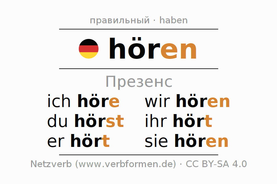 Спряжение hören (слушать, слышать) в настоящем времени Презенс: ich höre, du hörst, er hört, wir hören, ihr hört, sie hören
