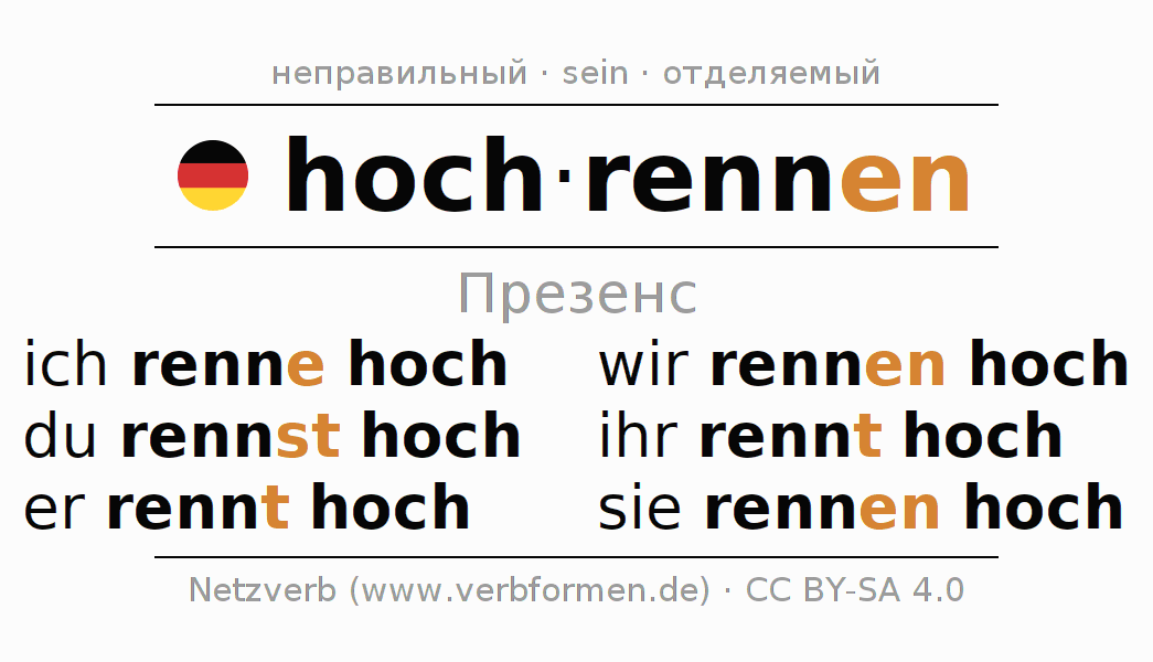 Спряжение hochrennen (бежать вверх, взбегать) в настоящем времени Презенс: ich renne hoch, du rennst hoch, er rennt hoch, wir rennen hoch, ihr rennt hoch, sie rennen hoch