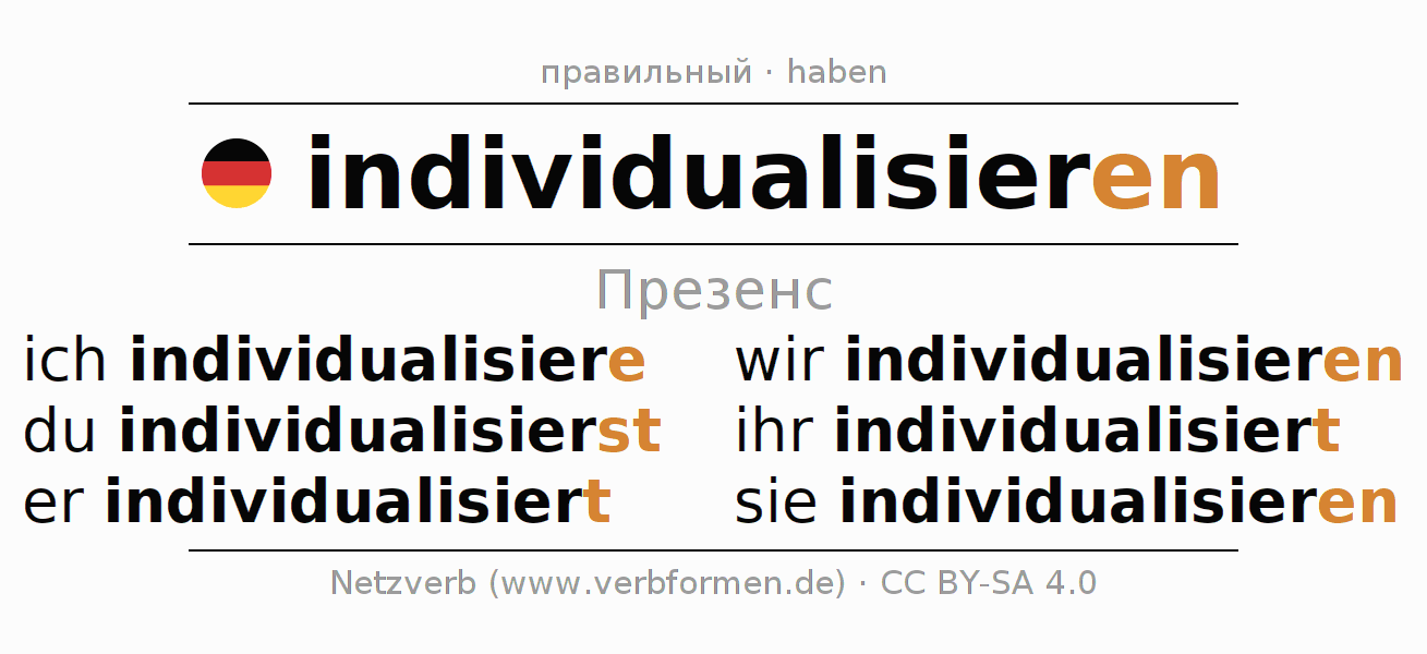 Спряжение individualisieren (индивидуализировать, особенствовать) в настоящем времени Презенс: ich individualisiere, du individualisierst, er individualisiert, wir individualisieren, ihr individualisiert, sie individualisieren