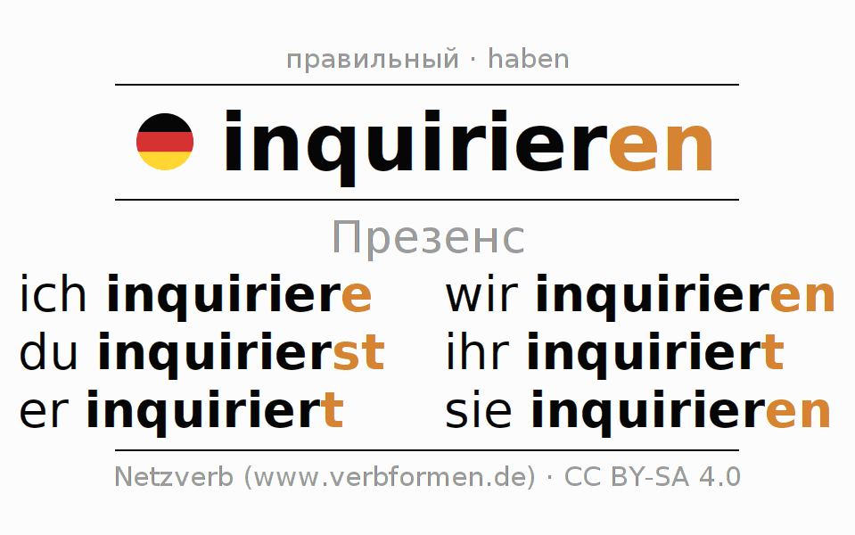 Спряжение inquirieren (допрашивать, расследовать) в настоящем времени Презенс: ich inquiriere, du inquirierst, er inquiriert, wir inquirieren, ihr inquiriert, sie inquirieren