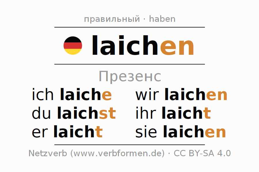 Спряжение laichen (метать икру, нереститься) в настоящем времени Презенс: ich laiche, du laichst, er laicht, wir laichen, ihr laicht, sie laichen