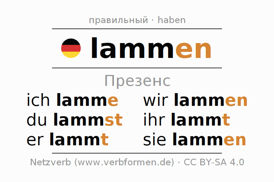 Спряжение lammen (объягниться, родить ягненка) в настоящем времени Презенс: ich lamme, du lammst, er lammt, wir lammen, ihr lammt, sie lammen