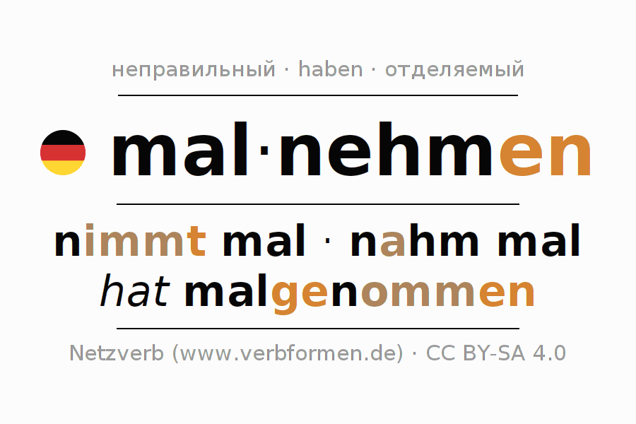 Спряжение malnehmen (умножать, умножить) в настоящем времени Презенс: ich nehme mal, du nimmst mal, er nimmt mal, wir nehmen mal, ihr nehmt mal, sie nehmen mal