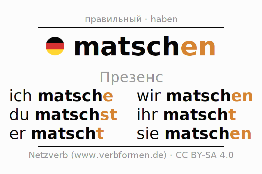Спряжение matschen (играть в грязи, месить) в настоящем времени Презенс: ich matsche, du matschst, er matscht, wir matschen, ihr matscht, sie matschen