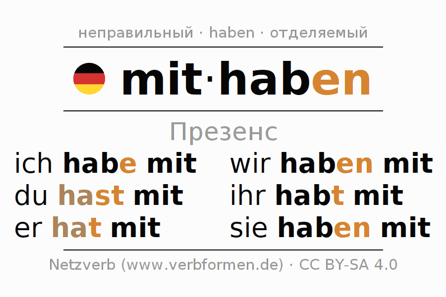 Спряжение mithaben (иметь с собой, иметь при себе) в настоящем времени Презенс: ich habe mit, du hast mit, er hat mit, wir haben mit, ihr habt mit, sie haben mit
