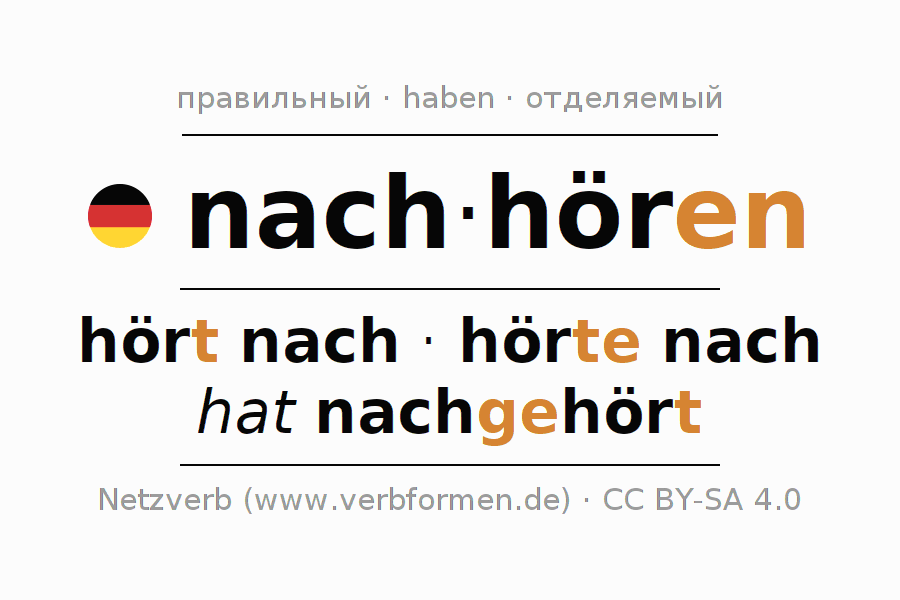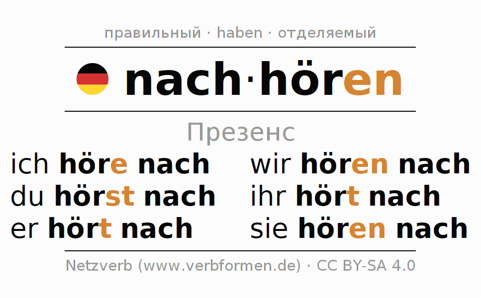 Спряжение nachhören (спрашивать, переслушать) в настоящем времени Презенс: ich höre nach, du hörst nach, er hört nach, wir hören nach, ihr hört nach, sie hören nach
