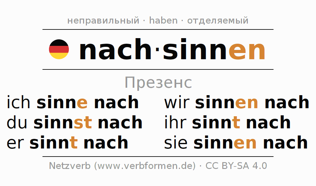Спряжение nachsinnen (размышлять, размышление) в настоящем времени Презенс: ich sinne nach, du sinnst nach, er sinnt nach, wir sinnen nach, ihr sinnt nach, sie sinnen nach