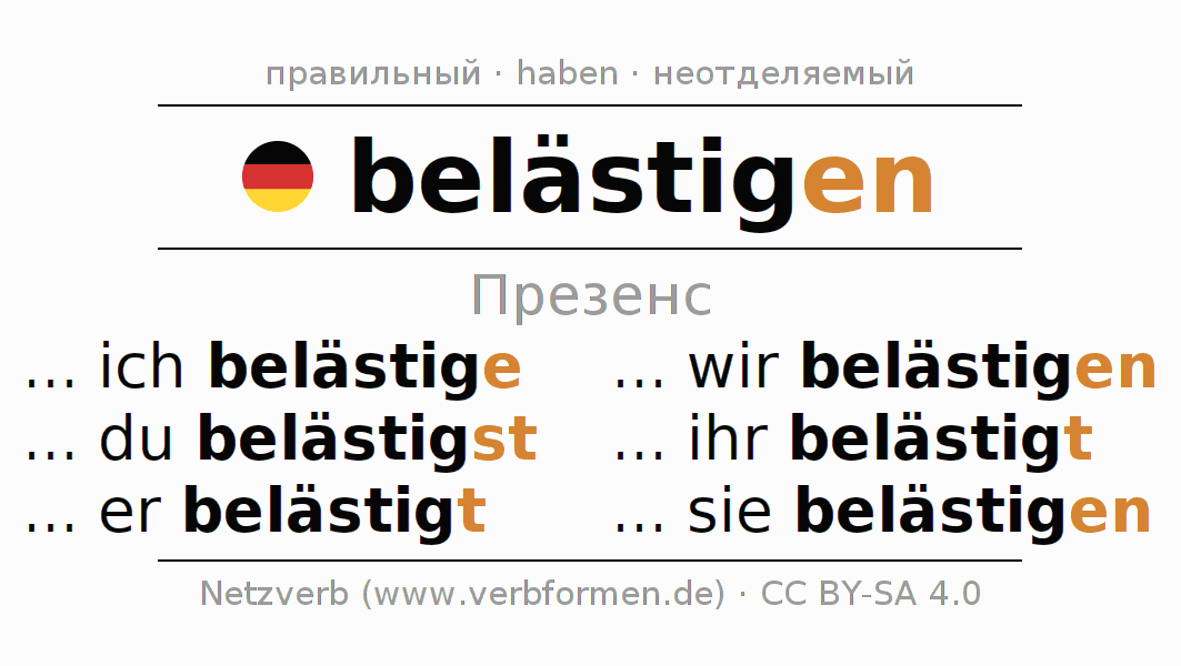 Спряжение belästigen в Презенс Индикатив Настоящее время Действительный залог (актив): ... ich belästige, ... du belästigst, ... er belästigt, ... wir belästigen, ... ihr belästigt, ... sie belästigen.Образование этих форм происходит по определённым грамматическим правилам. Так же спрягаются простые глагольные формы belästigen в Презенс. Kомментарии ☆
