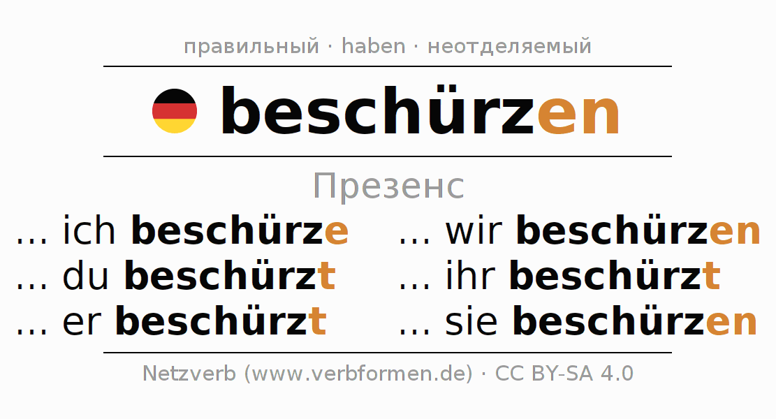 Спряжение beschürzen в Презенс Индикатив Настоящее время Действительный залог (актив): ... ich beschürze, ... du beschürzt, ... er beschürzt, ... wir beschürzen, ... ihr beschürzt, ... sie beschürzen.Образование этих форм происходит по определённым грамматическим правилам. Так же спрягаются простые глагольные формы beschürzen в Презенс. Kомментарии ☆