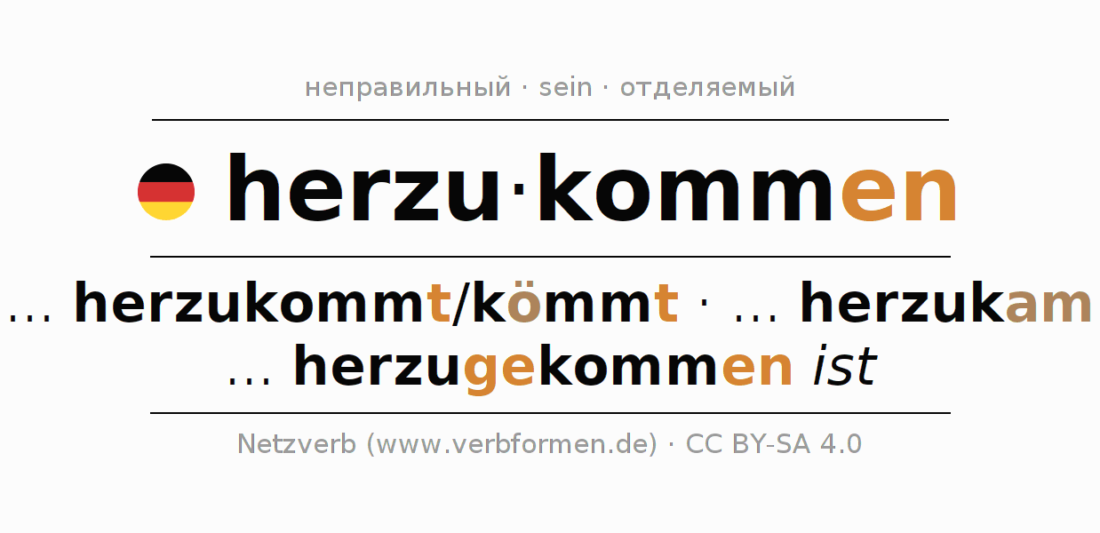 Спряжение herzukommen в Презенс Индикатив Настоящее время Действительный залог (актив): ... ich herzukomme, ... du herzukommst/kömmst, ... er herzukommt/kömmt, ... wir herzukommen, ... ihr herzukommt, ... sie herzukommen.Образование этих форм происходит по определённым грамматическим правилам. Так же спрягаются простые глагольные формы herzukommen в Презенс. Kомментарии ☆