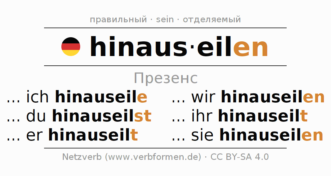 Спряжение hinauseilen в Презенс Индикатив Настоящее время Действительный залог (актив): ... ich hinauseile, ... du hinauseilst, ... er hinauseilt, ... wir hinauseilen, ... ihr hinauseilt, ... sie hinauseilen.Образование этих форм происходит по определённым грамматическим правилам. Так же спрягаются простые глагольные формы hinauseilen в Презенс. Kомментарии ☆