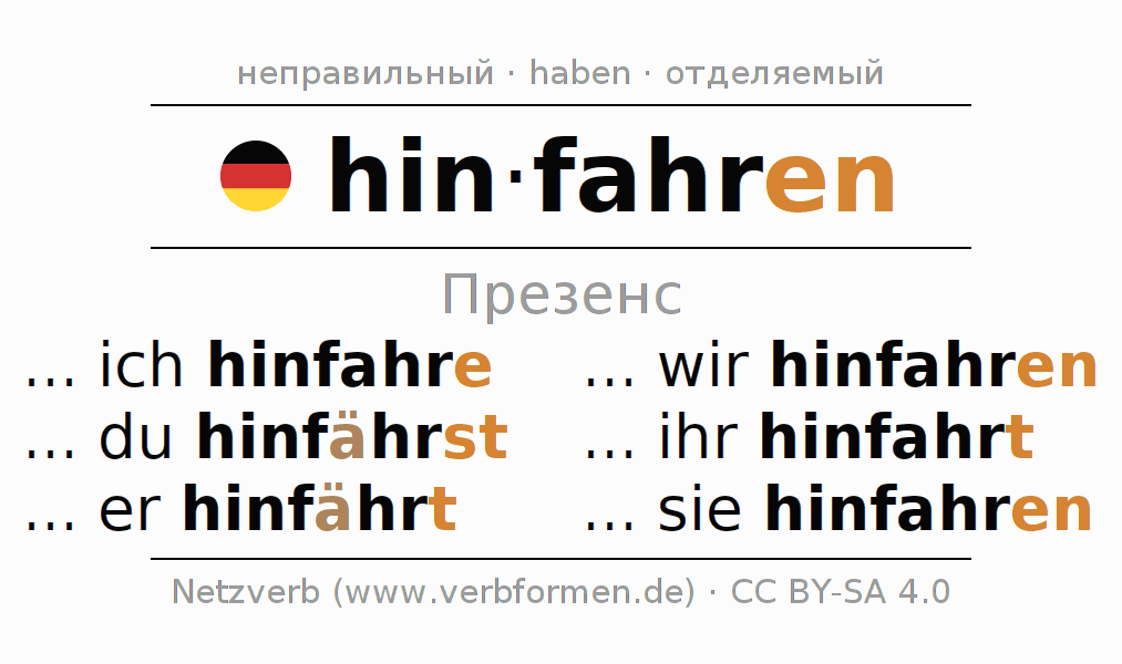 Спряжение hinfahren в Презенс Индикатив Настоящее время Действительный залог (актив): ... ich hinfahre, ... du hinfährst, ... er hinfährt, ... wir hinfahren, ... ihr hinfahrt, ... sie hinfahren.Образование этих форм происходит по определённым грамматическим правилам. Так же спрягаются простые глагольные формы hinfahren в Презенс. 1Комментарий ☆