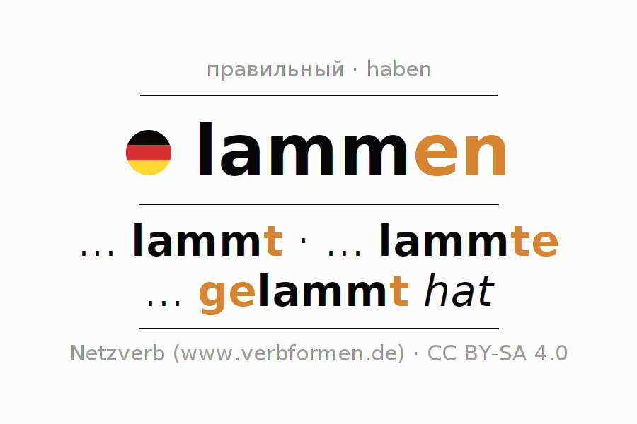 Спряжение lammen в Презенс Индикатив Настоящее время Действительный залог (актив): ... ich lamme, ... du lammst, ... er lammt, ... wir lammen, ... ihr lammt, ... sie lammen.Образование этих форм происходит по определённым грамматическим правилам. Так же спрягаются простые глагольные формы lammen в Презенс. Kомментарии ☆