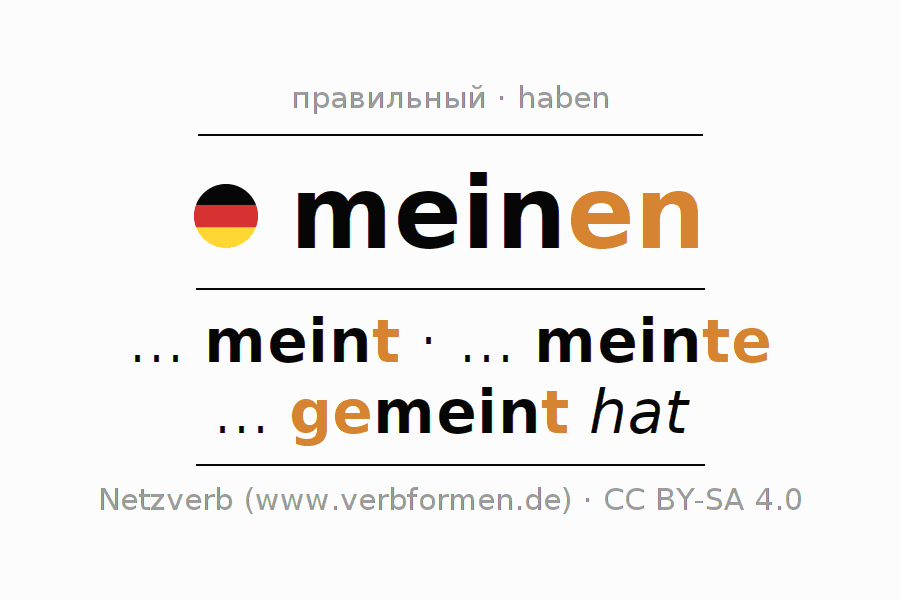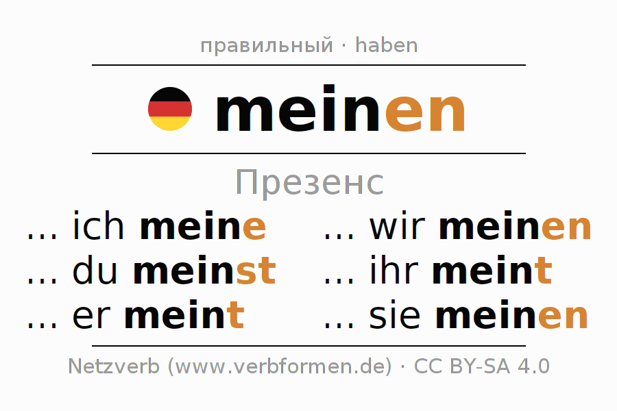 Спряжение meinen в Презенс Индикатив Настоящее время Действительный залог (актив): ... ich meine, ... du meinst, ... er meint, ... wir meinen, ... ihr meint, ... sie meinen.Образование этих форм происходит по определённым грамматическим правилам. Так же спрягаются простые глагольные формы meinen в Презенс. Kомментарии ☆