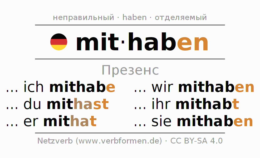 Спряжение mithaben в Презенс Индикатив Настоящее время Действительный залог (актив): ... ich mithabe, ... du mithast, ... er mithat, ... wir mithaben, ... ihr mithabt, ... sie mithaben.Образование этих форм происходит по определённым грамматическим правилам. Так же спрягаются простые глагольные формы mithaben в Презенс. Kомментарии ☆